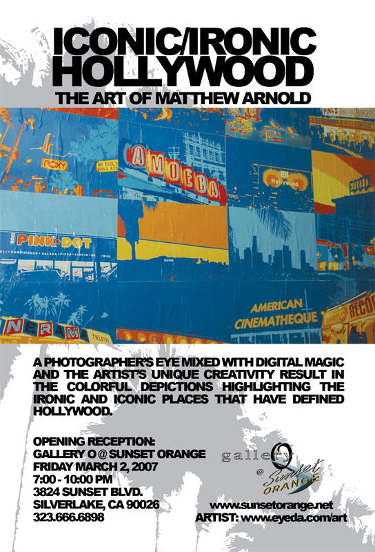 Gallery Show at Sunset Orange Gallery in Silverlake. 2007: PHOTOGRAPHER'S EYE MIXED WITH DIGITAL MAGIC AND THE ARTIST'S UNIQUE CREATIVITY RESULT IN THE COLORFUL DEPICTIONS HIGHLIGHTING THE IRONIC AND ICONIC PLACES THAT DEFINE HOLLYWOOD.